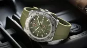 Schon die Farbe unterstreicht die Outdoor-Qualitäten des robusten Zeitmessers und weckt Abenteuerlust: Safarigrün präsentiert sich das Zifferblatt hinter 2,5 mm starkem, doppelt entspiegelten und dadurch nahezu reflektionsfreien Saphirglas. Gekonnt greift das flexible, angenehm weiche Kautschukband mit Titan-Dornschließe den Safari-Farbton auf. Nahtlos schließt es ans 30 atm druckgeprüfte Gehäuse an, das aus ultraleichtem, antimagnetischen, kratzfesten und korrosionsbeständigen Reintitan gefertigt wurde. Für perfekten Grip beim Zeitstoppen sorgen integrierte Großflächendrücker mit rutschfester Oberfläche. Alle Zeiger, Indexe und die Leuchtkapseln auf der Drehlünette sind Super-LumiNova beschichtet und auch bei Dunkelheit klar ablesbar. Zuverläs¬siger Taktgeber ist das Chronographenwerk Kal. T310, das von jeder Handgelenkbewegung automatisch aufgezogen wird und 62 Stunden Gangreserve bietet.